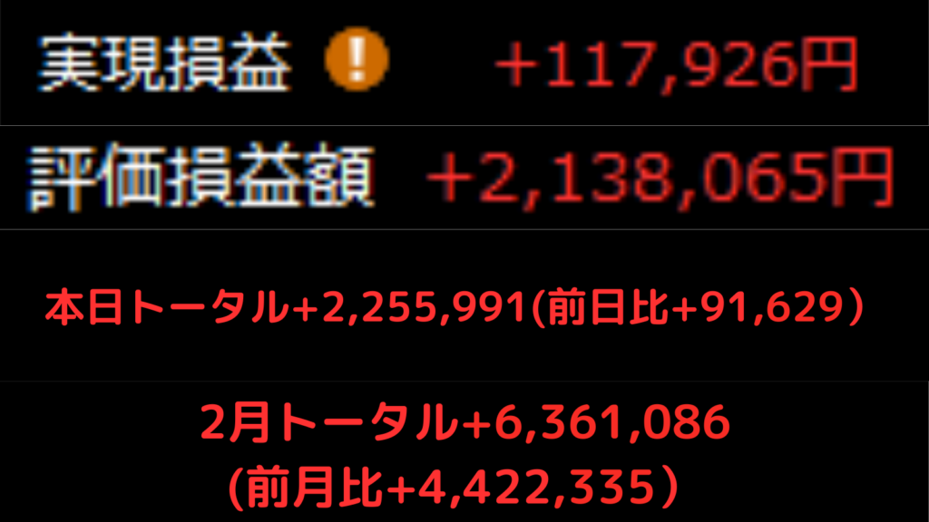2/24 デイトレ358日目 ~主力の反撃開始!前日比198万の大幅回復、ついに含み益へ!~