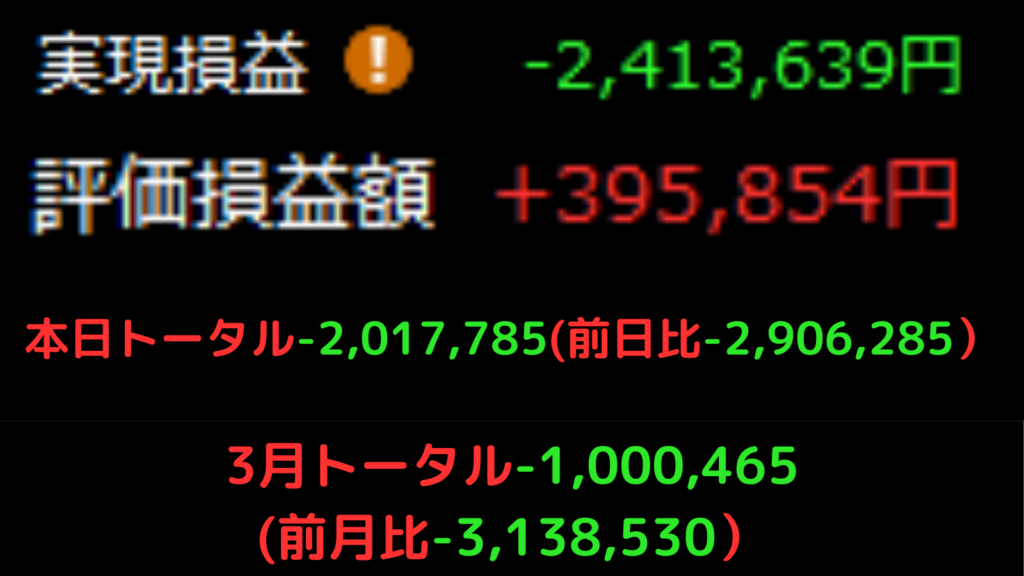 3/3 デイトレ363日目 ~日経-2000円の暴落!一時+400万の含み益が88万まで崩壊、前日比-174万の洗礼~