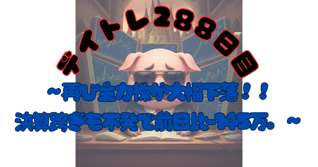 デイトレ288日目-再び主力株が大幅下落!!決算跨ぎも不発で前日比-145万。 みんな、こんばんは。 今日は昨晩の米国株の下落につられて、日本株も大きく下落スタートとなってしまいました。 昨日、復活の兆しかと思った主力株がまたしても大幅下落。ソフト...