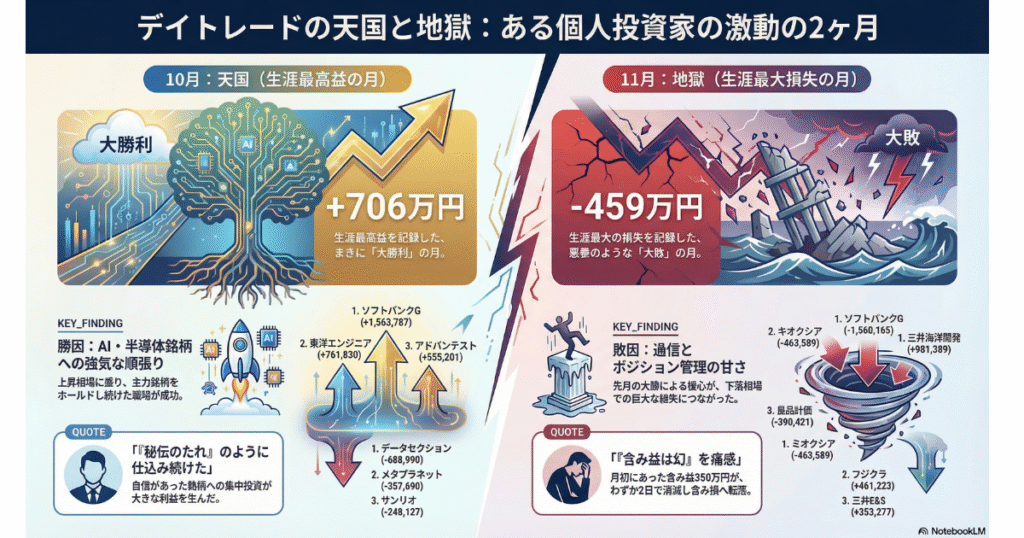 今月はかなり厳しい一ヶ月となりました。一番の原因はAI関連銘柄の大幅下落。これに対し甘く見過ぎていた。先月このAI関連銘柄で大勝してかなり自信があった。そう簡単に終わるはずがないとポジションも変えずに大きく持ち続けた結果大幅下落に耐えきれず損切りと、考え方の固執、調子が悪くなった時にもポジション量を変えず持ち続けた事が大敗につながったと自己分析しています。この辺りの切り替えをしっかりしないといけないと改めて感じました!