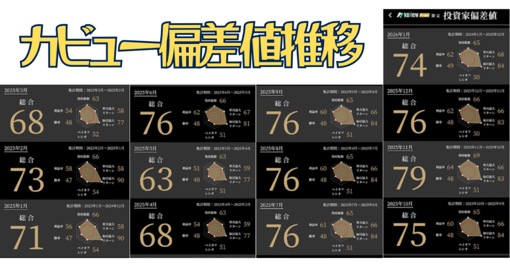 まずは、この「成績表」を見てくれ。 カビュウは、全ユーザーのデータを比較し、俺のパフォーマンスを「偏差値」として算出してくれる。 学校のテストと同じだ。50が平均、60で優秀、70なら天才。