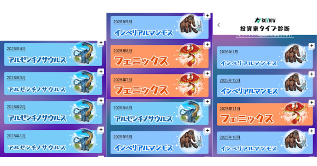 次に、俺の「戦い方の変化」を見てもらおう。 カビュウには、その月のトレードスタイルをモンスターに例えて診断する機能がある。