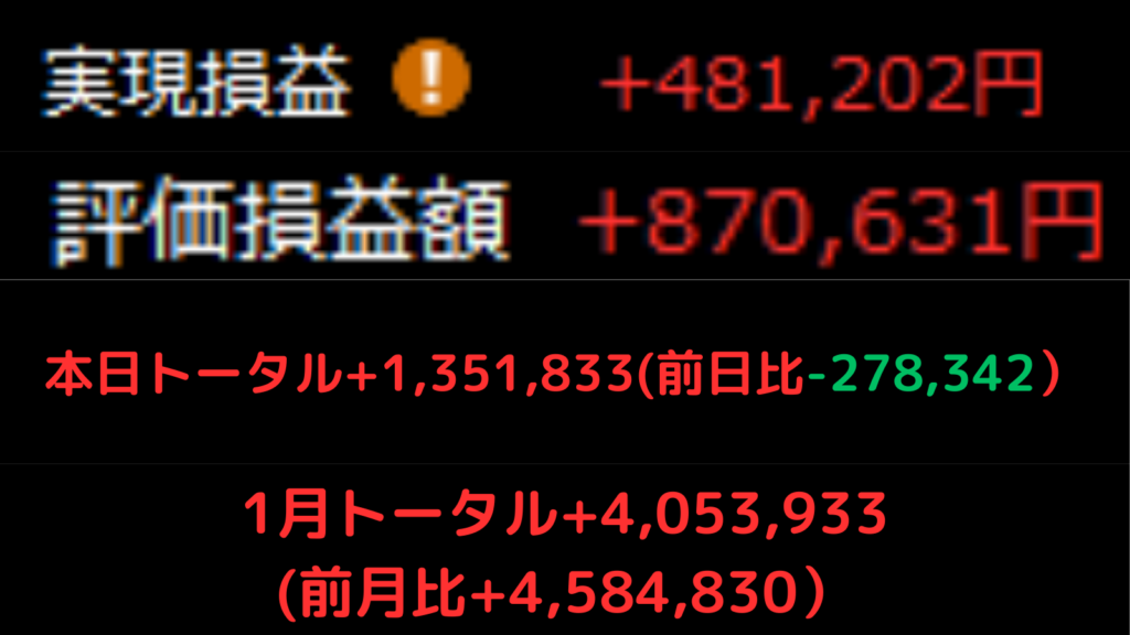 疲れ様です、さんぱちです。 米国市場はお休み、先物は下落中という不穏な空気の中、日経平均は続落しました。 私の資産も-27万とダメージを受けましたが、早めの利確作戦で本日の実現益は+48万を確保。これで1月の実現益は300万円を超えました。 しかし、...