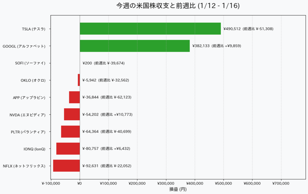 - 1/13(火): 絶頂。円安の追い風を受け、評価益は今週最高の92万円へ。