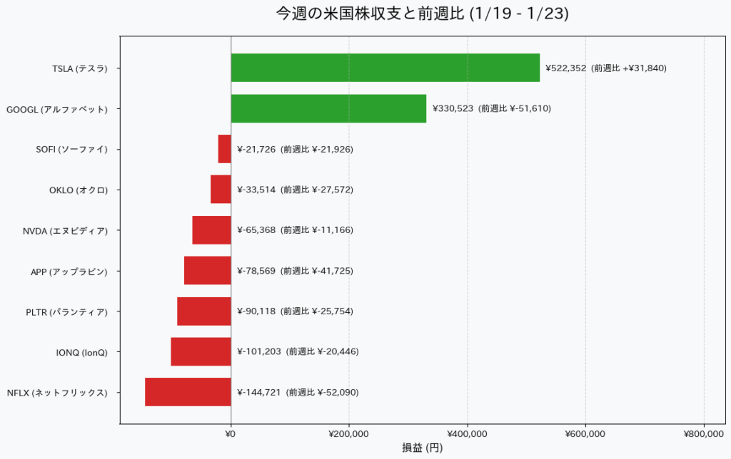 これこそが米国株投資の難しさであり、醍醐味(?)でもあります。 **「ドルでは勝っているのに、円では負けている」**という矛盾。 この為替の罠が、今週の着地をマイナス22万円へと押し下げました。