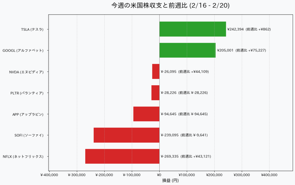 潮目を変えるべく、断行したのが主力銘柄の整理です。 PLTR(パランティア)、APP(アップラビン)、GOOGL(アルファベット)といった銘柄を損切りし、機体の軽量化を優先しました。