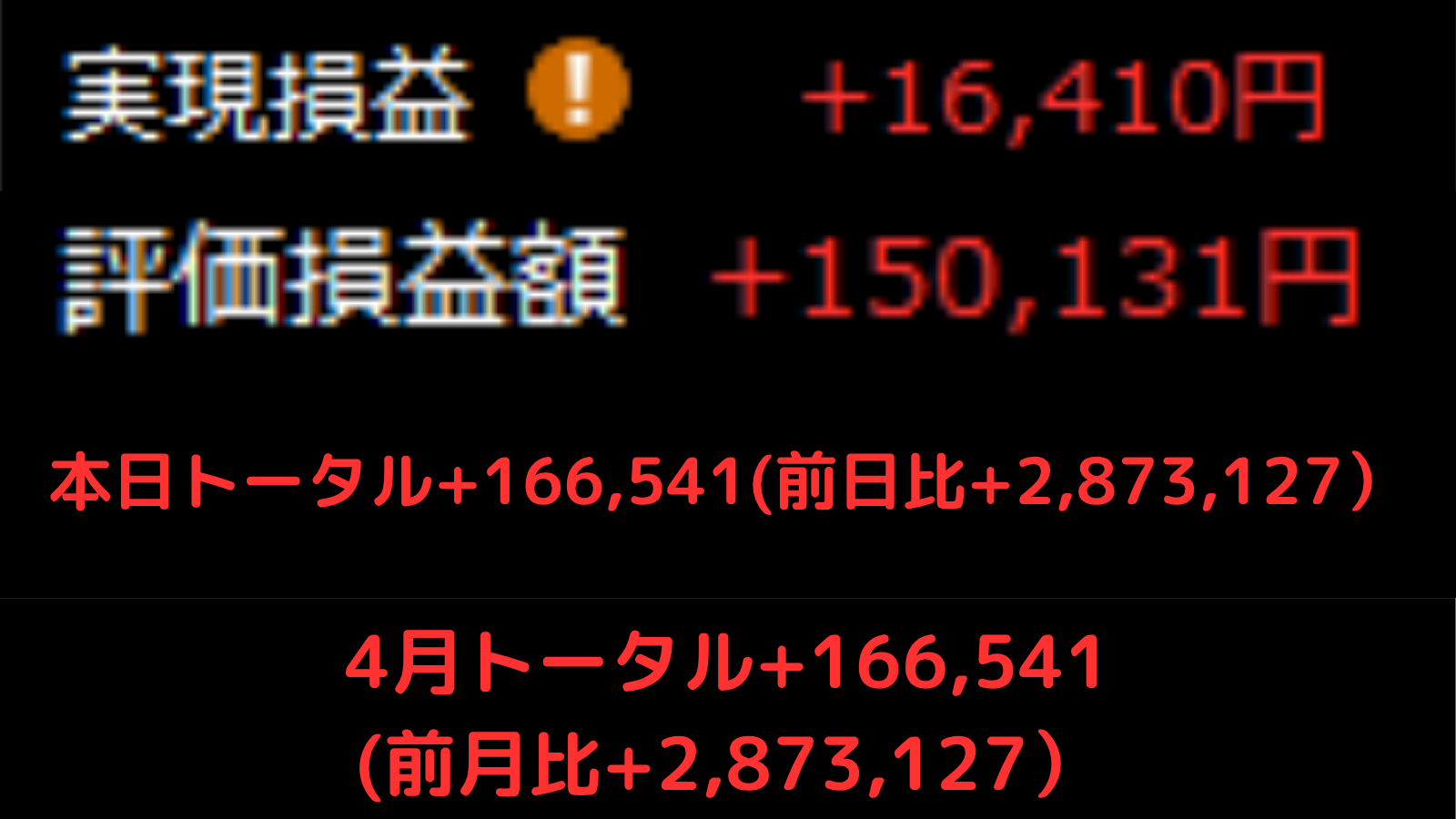 トランプ大統領のイラクとの停戦観測発言、さらにイラク側も呼応する形で昨夜の米国株が大幅上昇。SOX指数が特に強く、日本株先物も2000円近い上昇で4月をスタートした。寄りついた後もさらに右肩上がりという理想的な展開が続き、特にメモリー関連・半導体・金銀ETFが全面高となった。3月末に-270万まで膨らんでいた評価損が一日でプラス転換するという、自分でも驚く展開となった。