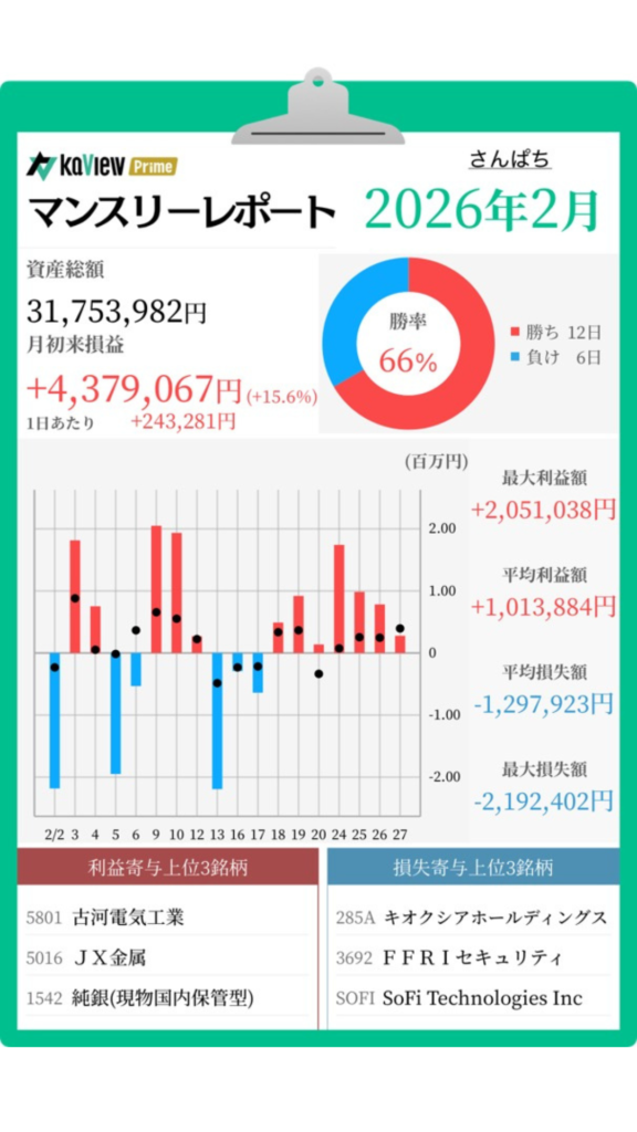 【考察】: 2月は単なる利益の積み上げではなく、古河電工等で得た利益をFFRI等の長年の含み損(負債)の清算に充てる「戦略的断捨離」を完遂した。これにより、機体(ポートフォリオ)はかつてないほど軽量化され、上昇気流(地合い)に対する反応速度が劇的に向上。3,000万という新たな高度での戦いに向けた、最強の布陣が整ったと言える。