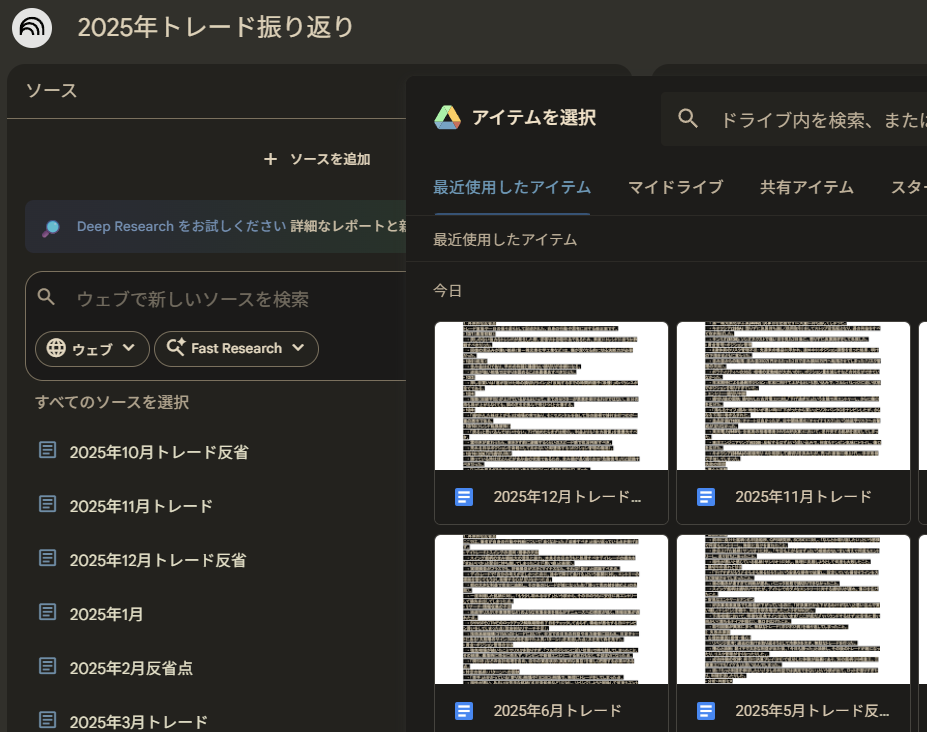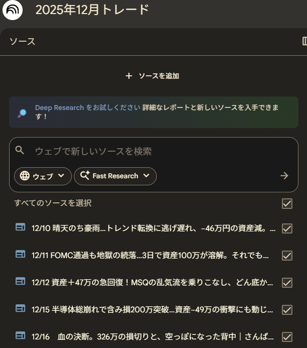 そこで、我らが参謀 Googleの「NotebookLM」 の出番だ。 こいつに全部読ませて、私の「負けパターン」や「メンタル崩壊の予兆」を分析させればいい。