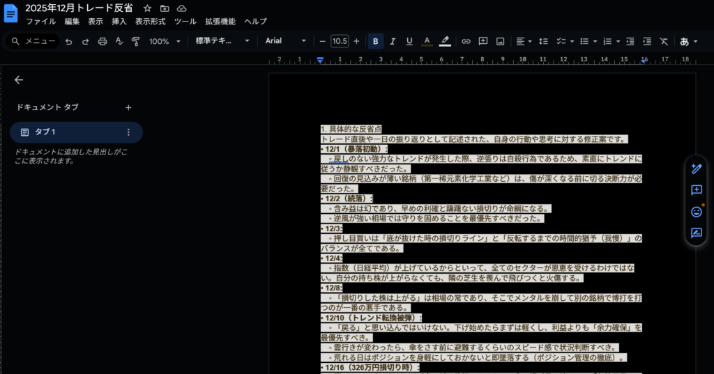 出力された12ヶ月分のテキストデータを、1つのGoogleドキュメント(またはテキストファイル)にベタッと貼り付ける。 これで、300記事分の魂が凝縮された「年間トレード全記録」という1つのファイルが完成する。