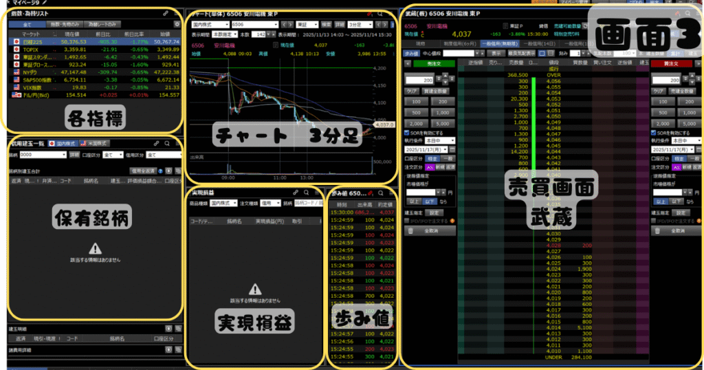 - マイページ機能で、武蔵(フル板発注ツール)、チャート、板の動きが分かる歩み値、建玉(ポジション)一覧、実現損益など、売買に必要な情報を全て詰め込んでいる。