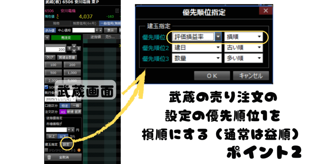 - 「武蔵」の「売り注文の設定」を開く。