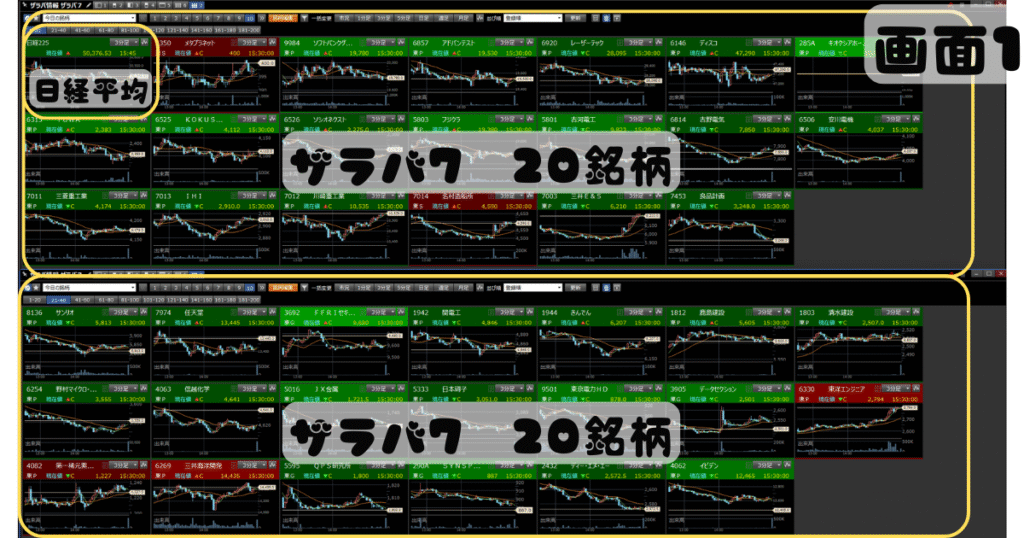 - 俺の「主戦場」となる監視銘柄リストだ。日経平均(※マケスピ2では日経225で代用)+39銘柄の合計40銘柄を、3分足チャートで一度に表示させている。
