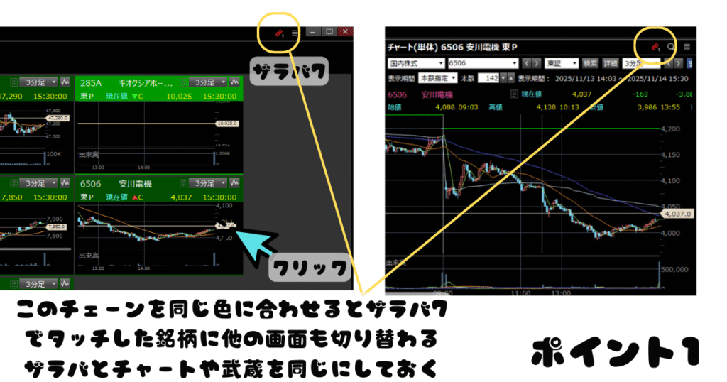 たったこれだけで、画面1で触った銘柄の情報が、自動で画面2・3に反映されるようになる。